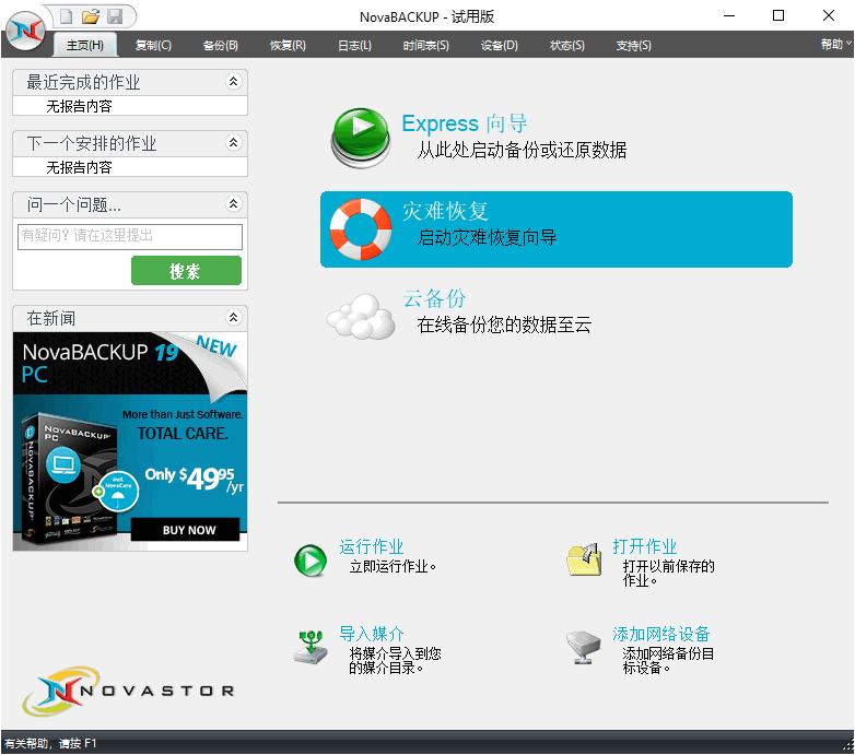 NovaBACKUP是一款强大的数据备份还原软件,这款软件可以为个人和企业提供一站式的数据备份和还原解决方案,帮助用户快速备份重要文件数据以防数据丢失;这款工具支持多种操作,它允许用户将文件备份到新的分区或硬盘中,还支持用户将数据备份到网络设备上;用户可以通过该款软件创建多个数据备份任务,等需要使用的时候再单独还原其中的任何一个;它可以直观的显示所有备份数据和设备信息,这便于您能直观的浏览它们;总而言之,NovaBACKUP PC是一个可靠的数据备份工具,它可以使数据免受计算机发生各种灾难或故障时所产生的影响。