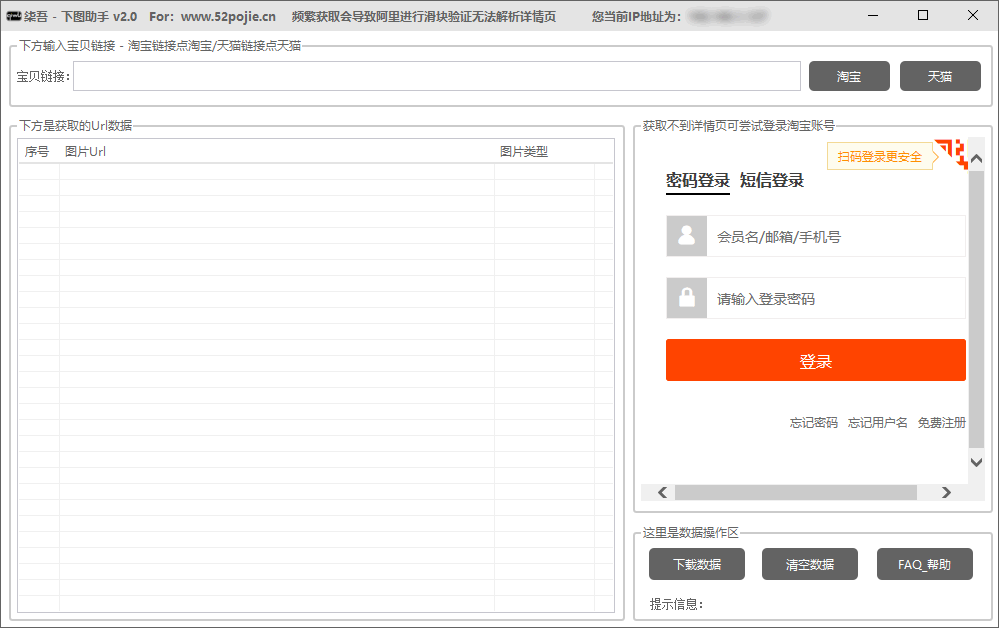 柒吾下图助手是一款免费的电商图片下载器,它支持天猫和淘宝两大电商平台;这款工具的操作方式便捷高效,只需添加宝贝链接就可以一键下载宝贝主图和详情图;很多用户在业余之时会通过帮助网店商家推广商品以赚取佣金,而在推广过程中宝贝主图和详情图是必不可少的资料;大多数用户选择手动保存图片的方式来下载需要的图片,这种方式非常低效,也很浪费时间;柒吾下图助手可为用户提供一键式宝贝图片批量下载功能,在这款工具的帮助下,用户手动保存一张图片的时间就足以下载所有宝贝图片,有需要的朋友赶紧下载吧。