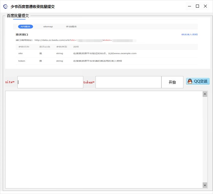 少爷百度普通收录批量提交工具是一款体积轻量、简单易用的站长工具,可帮助站长提高网站爬虫效率,使用这款软件用户只需输入site验证站点和token申请推送准入秘钥即可进行网站页面地址提交,可缩短爬虫发现网站链接时间,是一款非常简单实用的网站收录辅助软件;少爷百度普通收录批量提交工具,支持实时向搜索推送数据,可加快爬虫抓取速度,完成提交时用户可以在软件下方查看网站地址常规提交信息,便于用户不重复提交网页地址,非常的方便实用,有需要的用户可以自行下载。