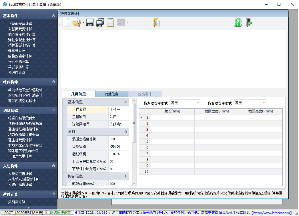 SCCT结构构件计算工具箱是一个强大的构件计算软件,这款软件包含几十种构件计算功能,可以为结构设计人员提供完善的构件计算解决方案,以此提升设计人员的工作效率;在结构设计的过程中往往会需要计算机各种构件的相关数值,而不同构件所采用的计算方式是不同的,尽管市面上也有一些用于计算结构构件数值的工具,但像这款包含数十种构件计算功能的软件却十分少见;SCCT结构构件计算工具箱的操作方式很简单,这得益于它拥有一个良好的人机交互界面,您可以很好的控制它完成构件的计算;该软件还有一个特色功能是它可以根据计算结果生成详细的计划书,以便用户校审使用。