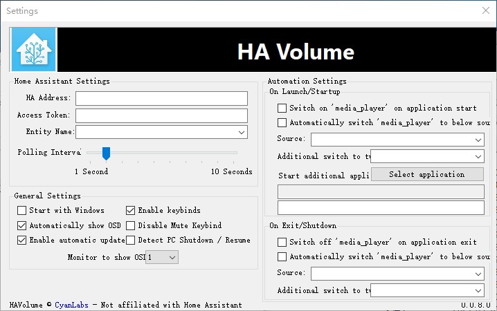 HA Volume是一款体积小巧、简单易用的音频控制软件,使用这款软件用户可以对VSX Volume的音频控制重新创建,可与Home Assistant上的任何音频播放设备仪器使用,该软件界面简洁直观、操作简单便捷,可通过设置音频各项参数来控制音频设备,非常简单实用;HA Volume可通过配置家庭助理、常规设置和高级设置中的功能来更好的控制音频设备,使用这款软件用户可以轻松便捷的打开或关闭音频设备,同时该软件支持键盘热键控制,可以轻松地更改热键设置,可让用户更灵活便捷的控制音频设备。
