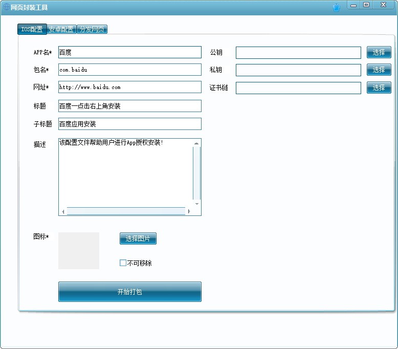 网页封装工具是一款功能强大、专业实用的网页封装打包软件,使用这款软件用户能够帮助用户将网页制作为安卓或IOS应用,用户只需输入APP名、包名、网址、版本名称、版本号、图标、启动图等参数即可进行一键封装,非常简单方便;网页封装工具界面简洁直观、操作简单便捷,使用这款软件用户可以对指定的网页进行封装,用户只需输入名称及需要封装的网页链接即可,同时该软件可以对网页图标进行设置,用户可以随意添加IOC图标文件,让网站的页面更有标志性,可以说是一款非常不错的网页封装软件。