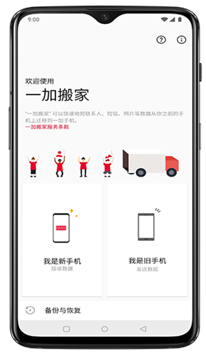 1、打开软件,选择【我是新手机】,再选择旧手机的类型,屏幕上方将显示下载【一加搬家】的二维码。