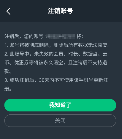 2.此账号中,未失效的会员、时长、数据盘、云币、优惠券等将被永久清空,且注销后不支持退款。