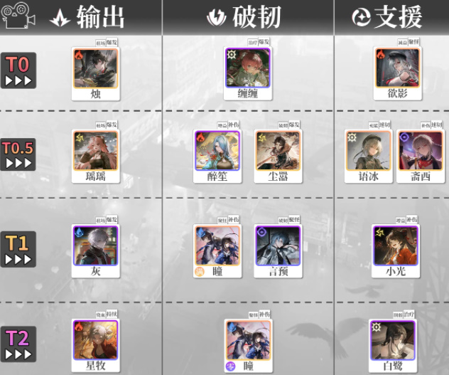 平民阵容:对于预算有限的玩家,推荐使用语冰、尘嚣和烛的组合。语冰作为核心输出角色,能够提供稳定的伤害输出,而尘嚣和烛则分别承担辅助和治疗的角色,支持语冰的输出,同时也具有一定的实用性,适合平民玩家投入资源培养。