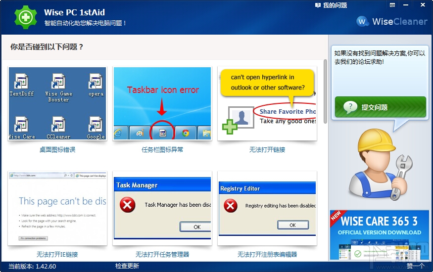 Wise PC 1stAid是一个和360电脑专家功能类似的软件,完全免费,全中文界面,软件内置了一些常见电脑使用问题的解决方案,如:ie无法打开链接、不能打开任务管理器、电脑运行速度慢、桌面图标错误等,都可以一键修复,如果您还有其他的问题,也可以提交给工程师。