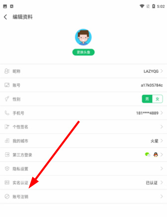 4、在编辑资料页面的最底部,可以找到注销账号。