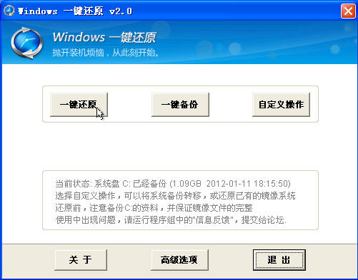 Windows一键还原是一款Ghost的中文辅助应用程序,无论您是电脑高手还是初级使用者,您只需要点击一下鼠标,一键还原,一键ghost软件将全自动帮助您实现检测并配置优秀的使用方式执行备份或还原当前的操作系统。