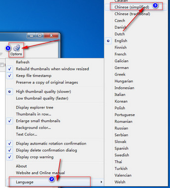 JPEG Lossless Rotator设置中文方法:在主界面,点选“Options”(选项)->“Language”(语言)->“Chinese(simplified)”(简体中文),即可。
