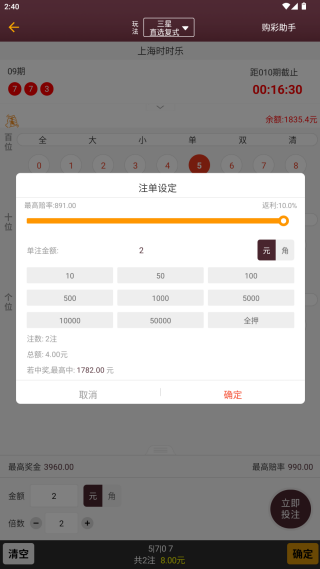 4、选中号码之后点击确定,然后可以对倍率进行调整,以及对单词金额进行调整;