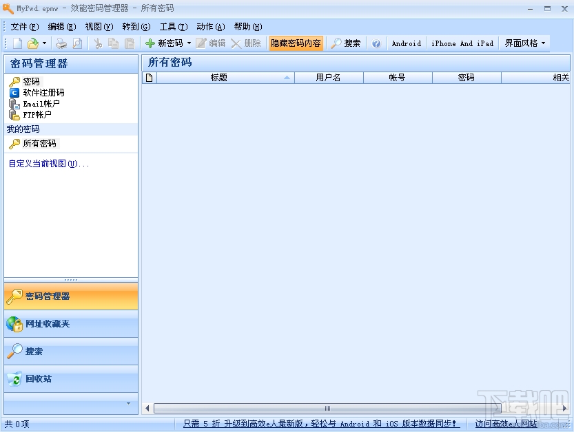 效能密码管理器:是否还在为了需要记住如此多的密码而烦恼?现在向您推荐效能密码管理器,这是一款完全免费、功能强大、独具特色的密码管理软件。她不仅仅能帮助您记住普通密码信息,还可以记录网站登录密码、软件注册码、Email帐户密码甚至FTP帐户密码等信息;通过集成的随机密码生成器,可以节约您的时间并让密码具有更强的安全性。文件登录主密码采用SHA不可逆算法加密,而密码信息本身则采用目前世界上加密强度高到之一的AES 256位加密算法加密,充分保护您的私有信息。效能密码管理器软件还有添加附件到密码记录,设置记录重要程度等诸多功能。软件界面时尚靓丽,提供不同配色方案的 8 种界面风格任您选择!拥有效能密码管理器,从此您只需记住1个密码。