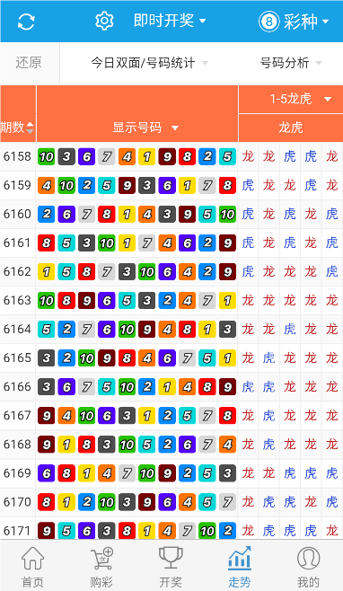 2、平台首界面可以看到购彩、开奖、走势和我的五大板块,彩票的投注和分析都在其中。