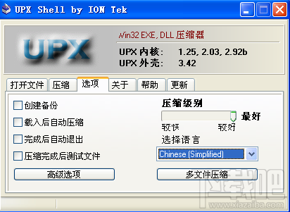 UPXShell简单实用的程序压缩、解压缩利器,压缩率高,支持EXE、COM、DLL、SYS、OCX等多种文件格式的压缩。海峰电脑家园制作,制作时,采用官方多语言原版,修正使用中文语言包时的显示错误,由于是使用语言包汉化的,第一次使用的时候,需要点击Options栏,在Select you languaga下拉菜单中选择简体中文。