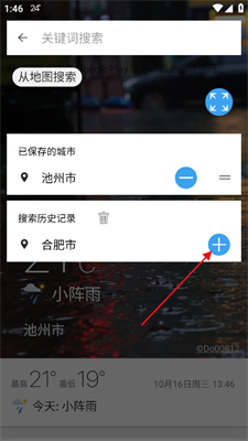 3、随后点击在搜索历史记录右侧加号按钮即可添加城市了。