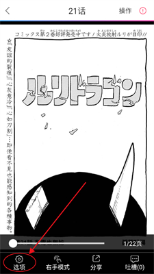 2、点击漫画中间的位置弹出菜单选择【选项】。