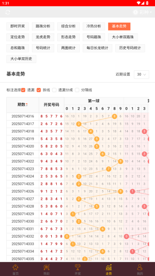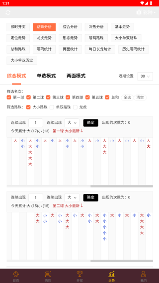 1、在走势图功能当中,总共位大家提供了不同类型方位的走势分析,在即时开奖当中可以查看今日双面、号码统计、号码分析、长龙提醒等,还可以调整近期设置,查看最多100条数据;