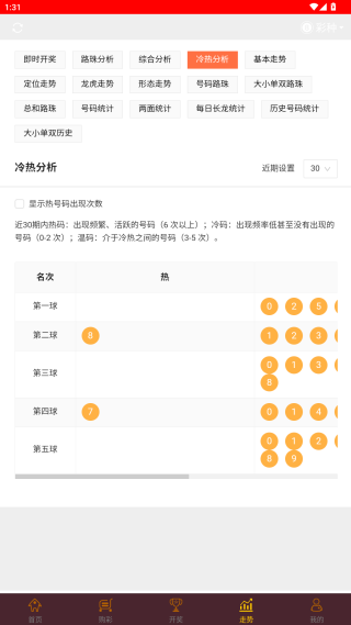 4、在冷热分析中,能够对每一次的开奖结果号码进行统计分析,给出冷热的结果参考;