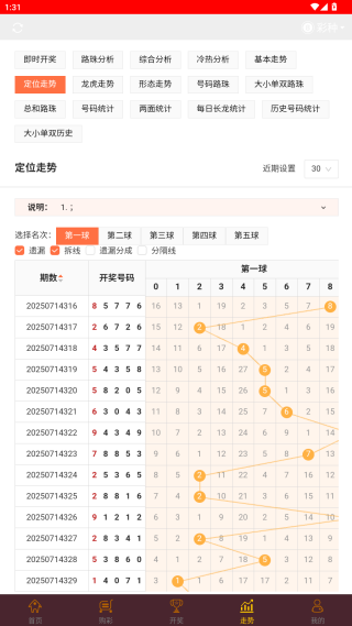 6、选择定位走势,能够也是能够看到对应的连线分析,第一球、第二球、第三球、第四球、第五球等等。