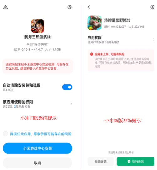 1、小米等手机在安装游戏时会出现风险提示(如下图),该情况属于应用商店常见的拦截,请注意要点继续安装。
