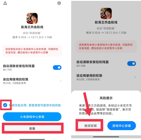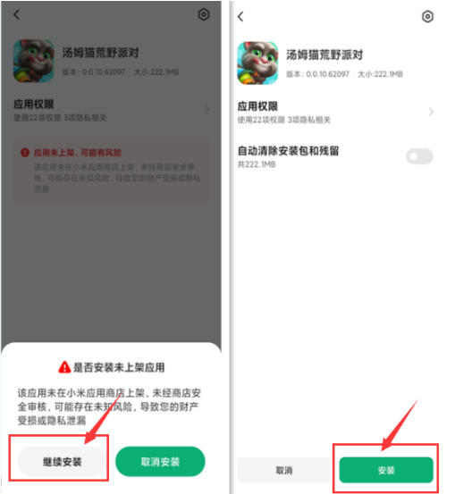 3、小米新版系统玩家:点击【继续安装】--点击【安装】即可完成游戏安装。