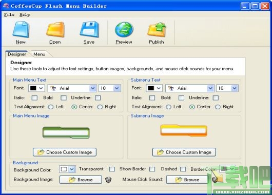 CoffeeCup Flash Menu Builder 是由CoffeeCup出品的一款使用简单、快速的菜单制作工具,能生成漂亮的web站点flash菜单,Flash Menu Builder包含大量高质量的按钮、背景和声音素材,可制作带阴影效果的菜单/子菜单、自定义按钮或文本。使用无须html或flash知识,简单易用。