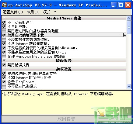 xp-AntiSpy您在使用Windows XP时会发现有很多需要系统自动连接网络的时候,这些是不是很安全呢?虽然微软说是不会收集个人的信息,只是收集电脑所要求的请求,但是……可不可以把这些自动的链接堵住呢? XP-AntiSpy 可以使您的 Windows XP 中全部的自动连接的选项关闭,它只是关闭自动部分,不会对您的系统有什么危害的,而且,由于关闭了许多后台服务,因此能提升系统性能也不言而喻。