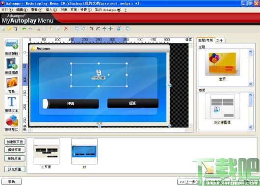当插入光盘或 U 盘时自动显示图形菜单供用户选择。您可以自行设计“启动画面” – 在程序菜单出现前显示的一段短的图形闪屏。您可以创建多页面菜单,里面包含功能按钮执行相应功能和导航按钮切换菜单页面,页面间转换时会显示过渡效果。按钮的功能包括启动程序、打开文档、打开网页、创建 Email 以及大量页面导航相关选项。您可以添加背景音乐和声音,选择只播放一次或在显示菜单时循环播放,支持多种格式音频文件。