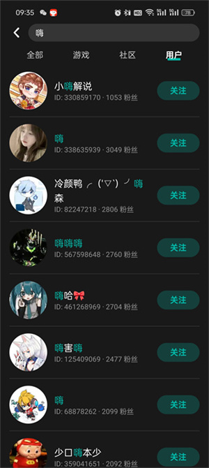 3、在搜索的结果中点击【用户】,之后在点击【关注】即可。