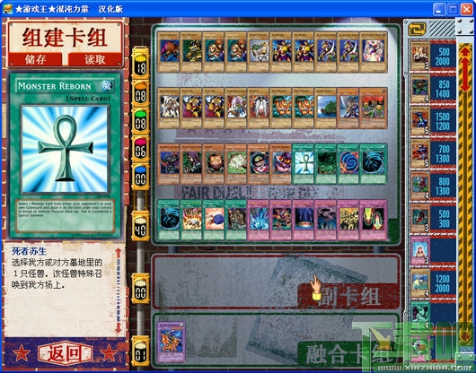 游戏王混沌力量相较于家用机平台上的“游戏王”系列游戏,这次汉化PC版的“游戏王”,可以算是真正的纸牌游戏,单纯的战术与智力的对决。在这款游戏中,不用把太多的精力放在搜集卡片、角色扮演上。这次更新了300张左右的卡,加上前两作一共有卡771张,而且新加的一些卡都不是那种没有效果或那些很基本的卡,DL系列中的卡的大部分都已经出现在游戏当中了。你拥有几乎所有的卡片,并且可以自行选择从这些卡片中整理出你想要的牌放入卡组中,以备决斗所需。这样一来,玩家就可以把精神完全放到卡片的组合上、战术的研究上来。