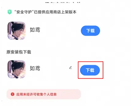 3、另外在下载过程中还可能出现应用商店版本的下载选择,如果需要官服而非渠道服的安装包则选择原安装包下载即可。