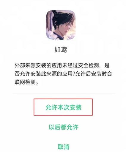 2、下载完成后进行安装,出现风险检测的提示时根据自身需求选择允许本次安装或是以后都允许即可完成游戏安装。