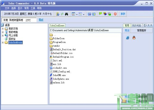 软件还具备如下功能(仍在不断完善):完整日历、皮肤更换、图片浏览、记事功能(独特亮点)、左右窗口交换、复杂选择、系统特殊文件夹、搜索、文本编辑器(简易)、天气预报等。