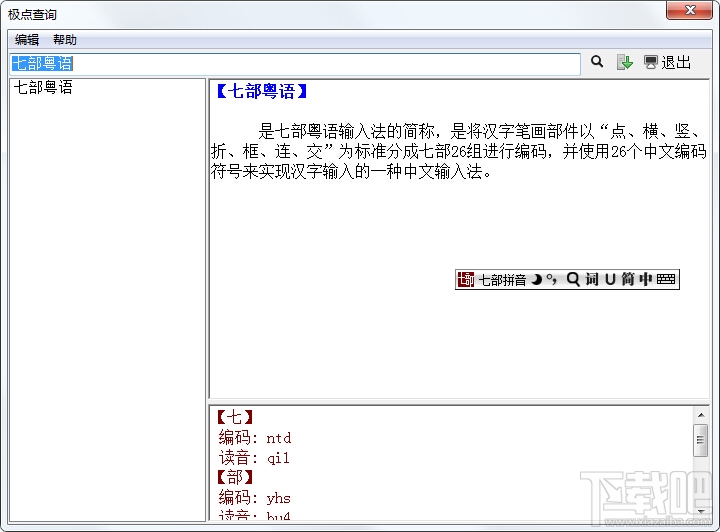 七部粤语输入法是新一代易学易用的纯形粤语输入法,完全不需要普拼或粤拼,就能准确地输入粤语字词,适合对拼音方案一窍不通的人群使用。它形象直观,通俗易懂,一经掌握,终生不忘;它没有助记词,不需要死记硬背,轻轻松松就能掌握。七部粤语输入法词库共收录逾8万条字词,当中包括6千多条粤方言词。粤语字词的输入大致有三种方法:普拼、粤拼和形码。由于熟练掌握粤拼的人很少,而现有的形码又较为难学,所以很多广东人都是使用普拼来输入粤语字词。七部粤语输入法是由七部形码输入法派生的,同样是采用26个中文编码符号输入汉字,与七部形码输入法的全新设计理念及创新专利技术一脉相承,是新一代的纯形粤语输入法。