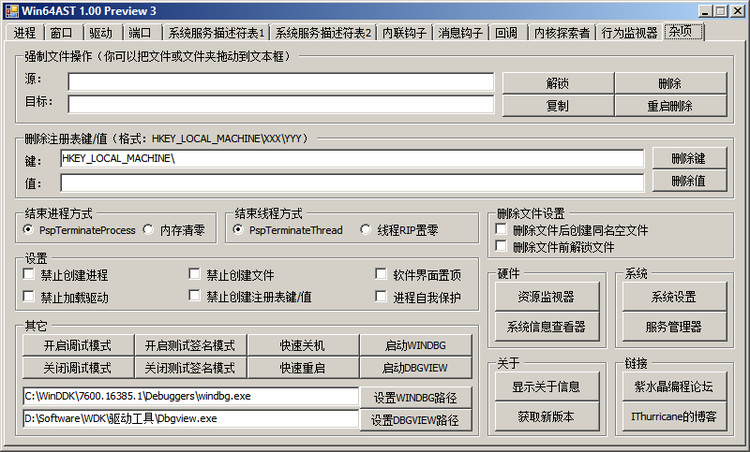 2.Win64AST目前实现的功能有:进程/线程/模块/句柄/窗口管理、查看内核模块、查看进程的端口、查看并恢复SSDT和Shadow SSDT、查看并删除消息钩子、扫描并恢复RING3/RING0的内联钩子、枚举回调、进程行为监视、内核内存编辑、强制解锁/删除文件、强制删除注册表键/值、禁止创建进程/文件/注册表键值、禁止加载驱动、校验文件签名等。