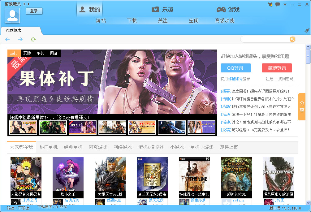 全民游戏,全民一起玩游戏!全民游戏是腾讯以QQ和微信社交平台为基础推出了系列手机游戏之一,其中以天天游戏系列和全民系列游戏最火爆。全民游戏借助微信和QQ的社交性,一经推出就火爆之极,全民都要玩。和小伙伴们一起全民游戏吧,勇争朋友排行榜第一。