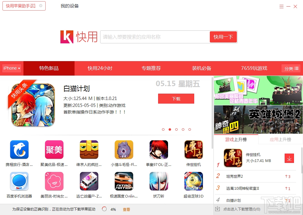快用苹果助手是是一款PC版苹果iphone/ipad助手软件。快用苹果助手官方下载版凭借独创的“免越狱一键安装”技术与“极简“风格的操作体验,得到了苹果用户的广泛关注,用户数量屡创新高。2012年9月,“快用苹果助手”宣布“全面支持新版苹果IOS6操作系统与iPhone5手机”。