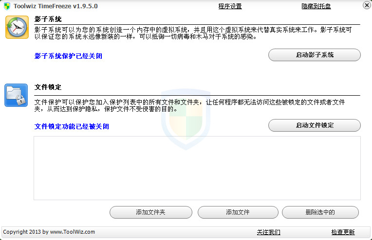 Toolwiz Time Freeze有「影子系统」跟「文件锁定」两大功能。「影子系统」可以为您的系统创造一个内存中的虚拟系统,并且用这个虚拟系统代替真实的系统工作。开启影子系统保护模式之后,所有对系统的更改,都将在重启后自动消失,除非你手动退出了影子系统(手工退出的时候可以选择是否在真实系统中保存你在影子系统中操作)。影子系统非常有用,当你的电脑感染病毒,被安装了恶意软件,或者进行了其他任何你不想要的更改,你都可以轻松的将电脑还原到之前符合你要求的状态。