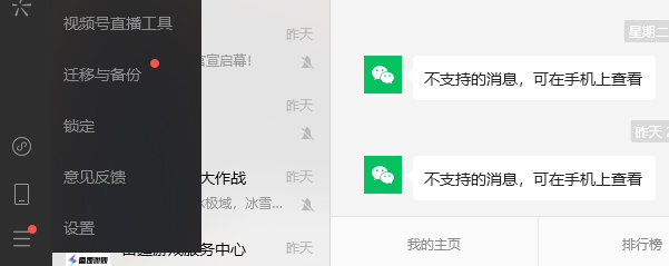 1、首先登录微信PC端,然后点击左下角的【三】。