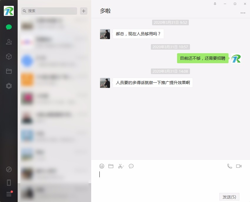 聊天窗口堪称“简陋”,可以发表情、截图以及文件,但仅此而已。另外,点击聊天对象名字,可添加多人聊天。
