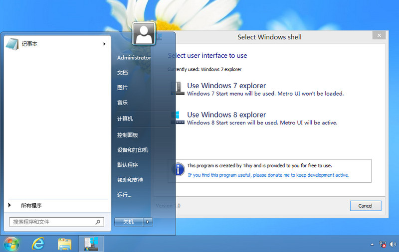 351 KB/2020-08-17Windows7explorerforWindows8(Ex7forW8)是国外网友Tihiy开发的一款小工具,可以将Windows8开始菜单替换为Windows7的样式。原理是提取Windows7中的explorer.exe,在Windows8中运行,实现找回传统开始菜单。