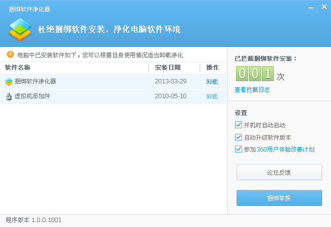 360捆绑软件净化器是360杀毒小组开发一款拦截捆绑软件安装的工具。去年及春节走亲访友期间发现,不太懂电脑的亲友桌面上多了许多图标,仔细询问才知道是在安装软件时一不小心被捆绑安装了其他不需要的软件,开机启动甚至占用大量资源,更有甚者无法卸载。