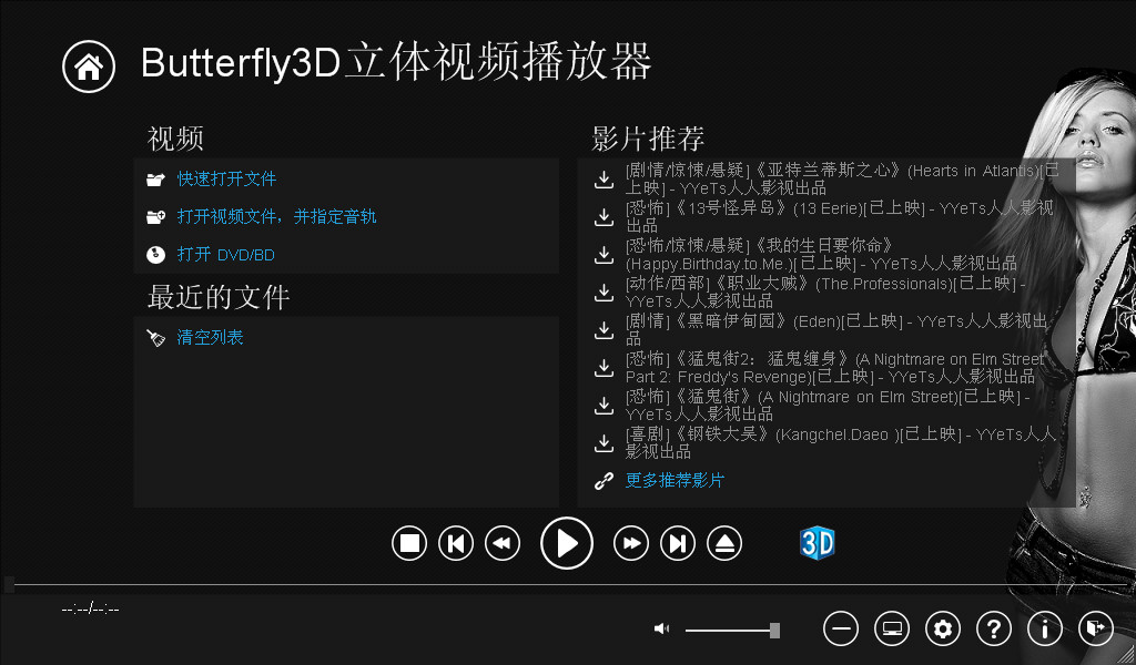 Butterfly3D 作者利用业余时间开发一个国人自己的免费立体播放器,Butterfly3D播放器支持WindowXP、Windows 7/8,支持显卡硬件解码加速,完善的中文字幕支持、3D立体字幕播放,支持在各种偏光式3D(不闪式3D)显示设备,包括3D显示器、3D电视;支持DLP 3D Ready投影机;支持AMD HD3D驱动方式播放;(所支持的显示设备列表)支持Nvidia 3D Vision主动式3D播放等等。
