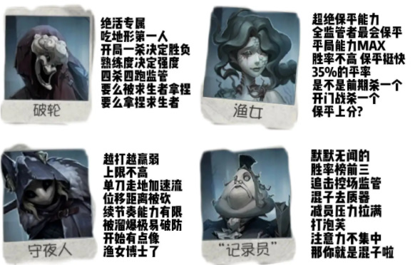 T2级别的角色有:渔女、小提琴家、噩梦。这些监管者同样拥有高伤害和高控制能力,渔女的“捕鱼达人”技能能在一定时间内提高攻击力和攻击范围,小提琴家的“狂野之弦”技能让他快速移动并提高攻击力,而噩梦的“噩梦侵袭”技能则能在一定时间内提高攻击力和攻击范围。