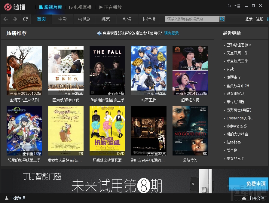 随播高清影视是一款在线观看影视和国内外电视直播的客户端软件,支持离线下载,可以播放本地文件。体积小、界面精美、无弹窗、绿色干净、安全无毒,退出程序无残留进程。智能汇聚海量视频,每天更新上万高清影视综艺动漫。您能边看边下载,还可以随意限速。云收藏、跳过片头片尾、快进快退、自动缓冲下集、记录播放位置和老板键等众多功能让您观看影视更加方便。随播采用优秀的缓存技术保护您的硬盘不受伤害。