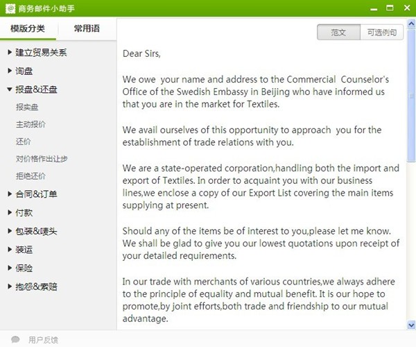外贸邮件助手让你3分钟搞定英文邮件,外贸邮件助手是一款集分类模块、范文例句、中英对照、商贸邮件管理为一体的外贸软件。可以迅速帮助外贸哥们姐们找到从询盘到交付售后写邮件所需的一系列语句,方便快捷实用。