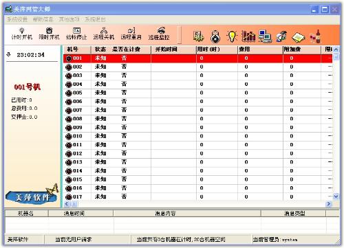 美萍网管大师软件是最实用的网吧管理系统。美萍网管大师集实时计时计费,计帐于一体,即可单独作为网吧的计费管理机,也可配合安全卫士远程控制整个网络内的所有计算机。可对任意机器进行开通停止,限时,关机,热启动等操作,并且具有会员制管理,网吧商品管理,每日费用统计等众多功能,是管理网吧,电脑游戏房,培训中心等复杂场合的纯软件管理解决方案。