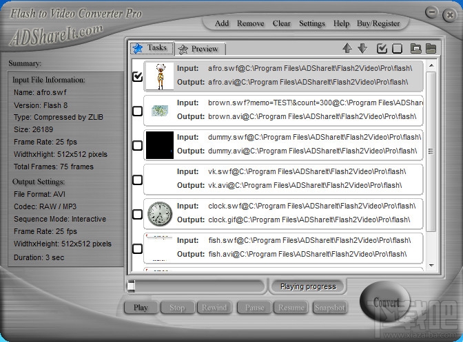 ADShareit SWF to Video Converter Pro 是一款功用强悍的视频转换软件,它能够将 Flash 电影文件转换为 AVI、MPEG(VCD、SVCD、DVD)、GIF 动画和图像序列。