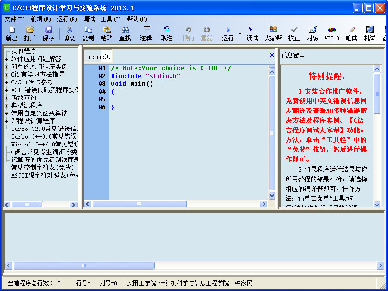 原名《Turbo C/C++ for Windows 集成实验与学习环境》,支持32位与64位的WINDOWS 7,它是从事一线教学的大学教师根据多媒体教学演示和C语言初学者的特点,量身打造的一个简单易用的C/C++程序设计教学演示、学习与实验软件(支持TC2/TC3、VC6、GCC四种编译器,单步调试功能免费,没有使用日期限制)。
