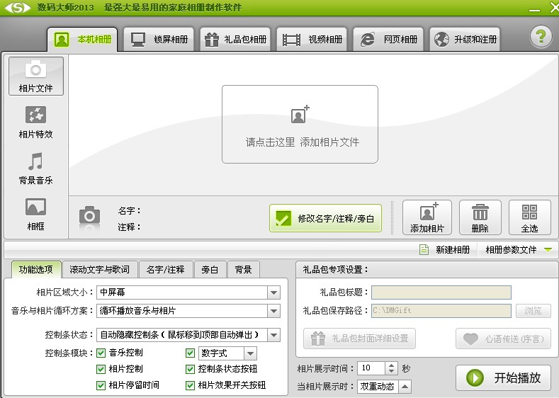 数码大师中的“本机电子相册”可以轻松将您喜欢的图片,数码相机拍出的照片等进行数码特技处理,配上动听的背景音乐、专业的切换特效、生动逼真的动态艺术场景、动感的镜头缩放特效、独特的文字与旁白特效、丰富的注释功能、个性多彩的艺术相框和独创的MTV歌词特效等,制造出一流专业效果的家庭数码相册。
