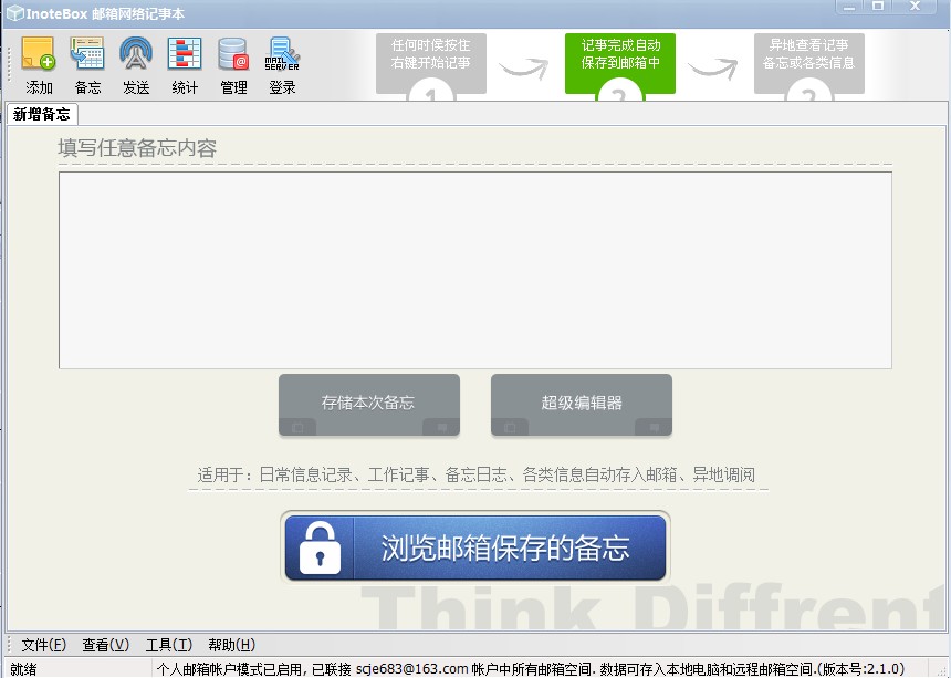 InoteBox邮箱网络记事本有着高速的运行效率,不占用系统资源,响应非常迅速,拥有完整的交互界面。随时随地添加备忘、个人灵感、记事内容、日志,输入任意内容,自动存储在自已的邮箱中,供异地调用,永远不会丢失。